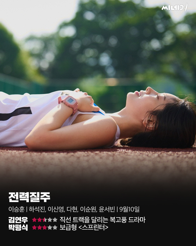 구영(하석진)은 육상선수다. 국내 남자 100m 최단기록 10.07초를 보유하고 있지만 세계선수권대회에 출전하려면 0.02초를 줄여야 한다. 은퇴 압박을 받는 데다 아내와는 이혼 직전이라 엄마 집에 얹혀사는 구영은, 매니저 준수(이순원)의 도움으로 기록 단축을 위해 온 힘을 다한다. 구영의 스포츠 드라마는 고등학생 승열(이신영)의 청춘 로맨스와 교차된다. 육상부 지은(다현)의 러닝 태도에 반한 승열은 유망주 근재(윤서빈)의 라이벌을 자처하며 무작정 훈련을 시작한다. <전력질주>는 김국영 선수가 세운 실제 기록에서 아이디어를 얻은 영화로, 좋은 의미로도 나쁜 의미로도 직선 트랙을 달린다. 기승전결과 목표가 뚜렷하며 의외의 한방도 있으나, 정해둔 결승선에 도달하기 위해 인물과 서사를 평평하게 다듬고 익숙한 허들을 배치한다. 낯익은 감각이 들 때 새어나오는 것이 웃음인가 한숨인가에 따라 호불호가 갈릴 것이다.