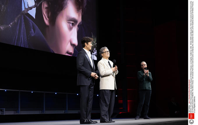 LA의 아카데미 영화 박물관에서 열린 <어쩔수가없다> 프리미어 스크리닝 행사에 참석한 배우 이병헌과 박찬욱 감독. SHUTTERSTOCK