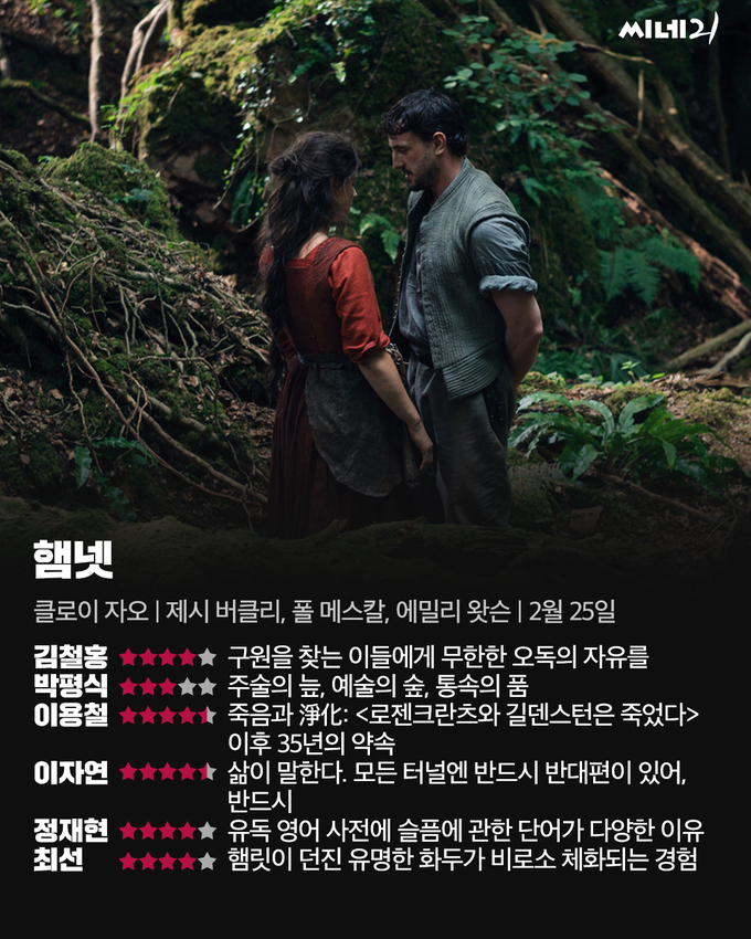 영어는 슬픔을 정의하는 명사, 형용사의 수가 특히 풍성한 언어다. 현대 영어의 창시자, 윌리엄 셰익스피어의 가족사를 다룬 <햄넷>은 영단어의 속성처럼 슬픔의 스펙트럼을 펼쳐 보인다. 단 영화는 셰익스피어가 아닌 그의 아내 아녜스(제시 버클리)에 초점을 둔다. 누구보다 남편 윌(폴 메스칼)을 이해하고, 가족을 사랑하는 아녜스는 무작위로 찾아드는 삶의 고통 앞에 몸부림친다. 그중 가장 큰 불행은 어린 아들 햄넷과 관련이 있다. 비탄에 잠식당한 아녜스는 남편이 희곡의 갈래인 비극으로서 부부 공동의 비극을 독대한 결과물을 마주한다. <햄넷>은 언뜻 치유로서의 예술을 다루는 듯 보인다. 하지만 영화는 그 치유에 도달하기 위해 거쳐야 할 수많은 상실 속에 아녜스와 함께 머문다. 배우 제시 버클리가 인간이 겪는 고초와 환희, 냉담과 동경을 스크린에 투사하며 경력 최고의 연기를 선보인다.