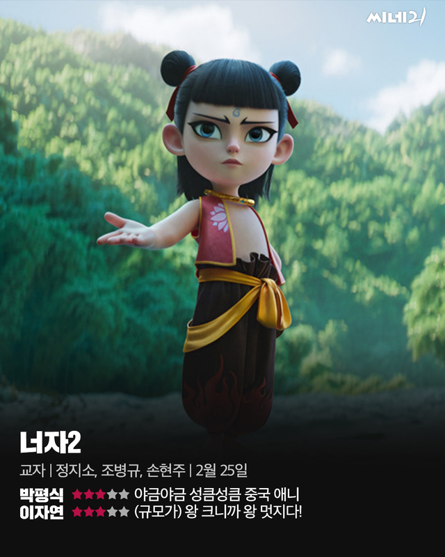 전 세계 애니메이션 역대 흥행 1위, 누적 관객수 3억2400만명. 중국영화 역사상 최고 흥행 기록을 달성한 <너자 2>가 드디어 공개된다. 중국 고전소설 <봉신연의>를 각색한 영화는 고대 신(神) 너자의 탄생기를 담은 <너자>의 후속작이다. 너자(정지소)와 그의 친구 오병(조병규)이 세상에 오게 된 과정이 전편의 주요 줄거리라면 <너자 2>는 인간계를 지키는 과정에서 벼락을 맞고 육신을 잃은 너자가 몸을 되찾고 선인들의 세 가지 미션을 통과하며 진정한 영웅으로 거듭나는 과정을 다룬다. 영화 초반에 전편의 이야기를 리듬 있게 요약해주기 때문에 <너자 2>로 시리즈를 시작하기에도 무리 없다. 신, 인간, 요괴가 뒤섞여 사는 세상에서 삼계의 균형이 흔들리기 시작했다는 사실을 인지한 너자는 스승과 함께 근원지를 찾아 떠난다. 영화는 단순한 모험담처럼 보이지만 구조적으로 세 가지 단층으로 이뤄져 있다. 천상계에서 홀로 수행 미션을 거듭해 나가는 너자의 관점, 마을에 남아 갑작스레 벌어지는 문제를 직면하는 오병의 관점, 그리고 감춰진 어둠의 진실 하나. 서로 다른 세 가지 측면은 흐름에 따라 서로 경쾌하게 끼어들고 뒤엉키기를 반복하며 다층적인 세계관을 누리는 재미를 준다. 특히 <너자 2>에서 최고 방점을 찍은 것은 ‘규모성’이다. 텐트폴 블록버스터 SF영화를 집약한 듯한 대규모 액션과 화려한 전투는 애니메이션이라는 장르의 한계선을 가뿐히 뛰어넘는다. 마지막 거대 군대의 전투 신을 찍는 데만 1년 반이 투자된 만큼 가히 압도적이다.
