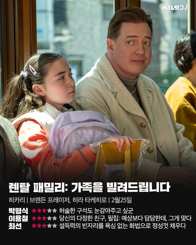 도쿄에서 살아가는 미국인 무명 배우 필립(브렌던 프레이저)은 가족 임대 서비스 회사에 들어가 의뢰인의 생활 속 빈자리를 채워주는 역할을 맡는다. 남편이 되고, 아빠가 되고, 친구가 되는 동안 그는 연기와 현실의 경계가 흐려지는 순간을 마주한다. 가족이라는 울타리 안에서 각자의 역할을 감당하느라 정작 자신을 위한 자리는 비워둔 인물들. 이들의 초상은 현대사회가 만들어낸 새로운 형태의 부재를 보여준다. <더 웨일>로 아카데미 남우주연상을 수상하며 오랜 공백을 깨고 재기에 성공한 브렌던 프레이저는 이 작품에서 친근한 모습으로 자아를 찾아가는 여정을 따뜻하게 그린다. 돈을 지불하고 가족을 빌리는 설정이 새롭지는 않아도 브렌던 프레이저의 꾸밈없는 연기와 스크린을 꽉 채우는 에모토 아키라의 존재감이 영화에 힘을 더한다. 우리가 채우려는 건 가족의 빈자리가 아니라 마음의 빈자리임을 욕심 없는 화법으로 전한다.