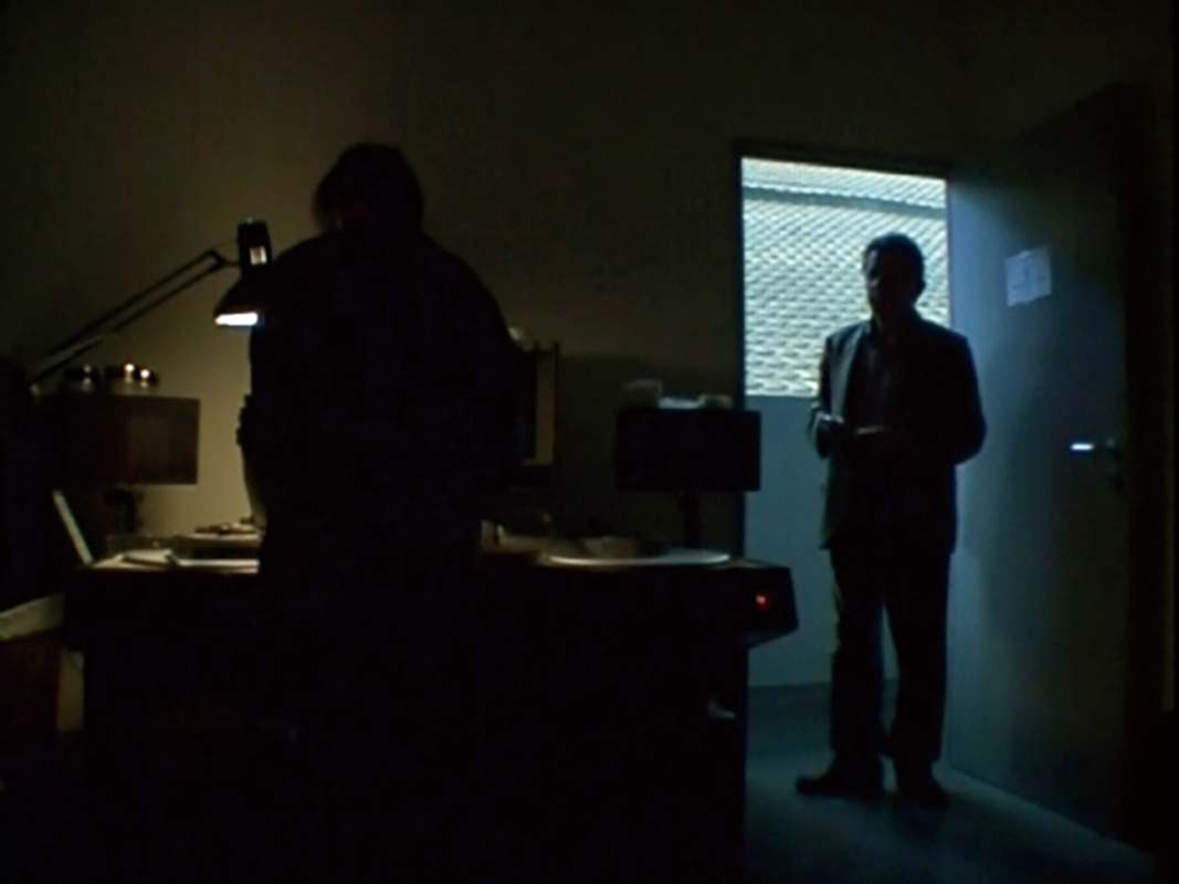 코스타는 스트로브가 오가는 저 작은 문을 중대한 가능성의 장소로 바라본다. “편집실에서 문을 바라보게 되기까지만 한달이 걸렸다. 문을 드나드는 장마리의 모습을 보았을 때, 나는 가능성과 픽션을, 벽 뒤에 있는 것을 보았다”라고 말한다. 그의 증언처럼 <당신의 숨겨진 미소는 어디에?>에서 문을 드나드는 움직임은 픽션의 가능성을 품은 행위로 펼쳐진다. 열린 문안으로 걸어간다는 것, 그 내밀한 장소를 방문한다는 것은 크든 작든 얼마간의 불안을 동반한 탐색이자 아직 밝혀지지 않은 비밀에 근접하는 몸짓이기 때문이다. 스트로브는 지극히 익숙하고 평범한 편집실 문 안팎에서 마치 낯선 장소를 방문하는 사람처럼 서성거린다. 잠시 안으로 들어갔다가 계속 머물 수 없다는 듯이 밖으로 나온다. 그는 타인의 집을 방문하는 존재처럼 편집실에 들어선다.