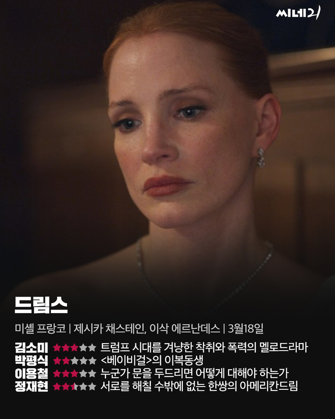 미셸 프랑코는 오랫동안 육체적·정신적 고통 앞에서 몸부림치는 개인을 탐구해왔다. 그러나 전작 <메모리>를 기점으로 그는 변화의 기미를 내비쳤다. <드림스>는 제니퍼와 페르난도의 관계를 통해 멜로에 기반한 ‘프랑코 2기’가 한층 원숙해졌음을 드러내는 작품이다. 한편 제니퍼와 페르난도는 현실의 문제가 닥치는 순간 생존 본능을 앞세워 서로를 절망의 한가운데로 무심코 밀어넣는다. 이 점에 있어 <드림스>는 프랑코의 지난 특기를 재차 각인하는 영화이기도 하다. 다만 고통에 접근하는 작가의 필치가 기존의 작법을 답습하는 듯한 인상을 남겨 아쉽다. 영화는 트럼프 집권 2기 미국의 반이민정책을 환유한다. 두 연인이 상대방에게 요구하는 사랑은 젠더, 인종, 계급 등 현재 미국 사회를 논할 때 빠뜨릴 수 없는 일변도를 연상시키는 동시에 제목 ‘드림스’ 앞에 생략된 한 단어를 상상하게 만든다. 그것은 ‘아메리칸’일 테고, 백인 대부호 여성과 히스패닉 난민 남성이 바라는 아메리칸드림은 서로를 해칠 수밖에 없다.
